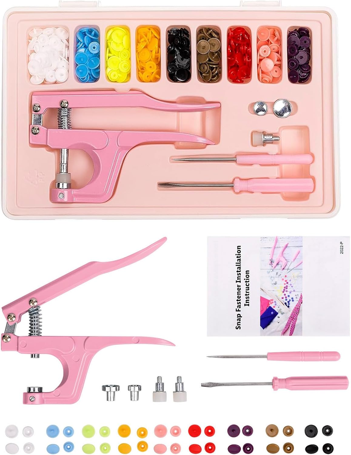 Plastic Snap Fastener Kit with Plier Screwdriver Awl and Storage Case, 100 Sets Snaps, 9 Colors T5 Buttons, 12mm Cap. Snap Plier for T3(10mm), T5(12mm), T8(15mm) Buttons
