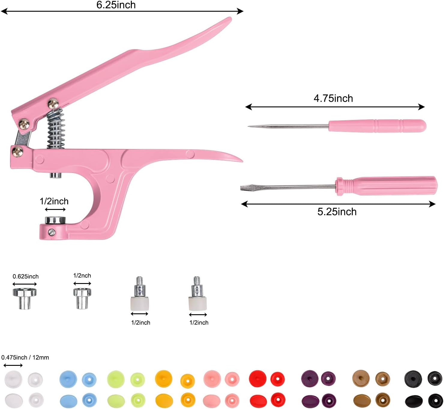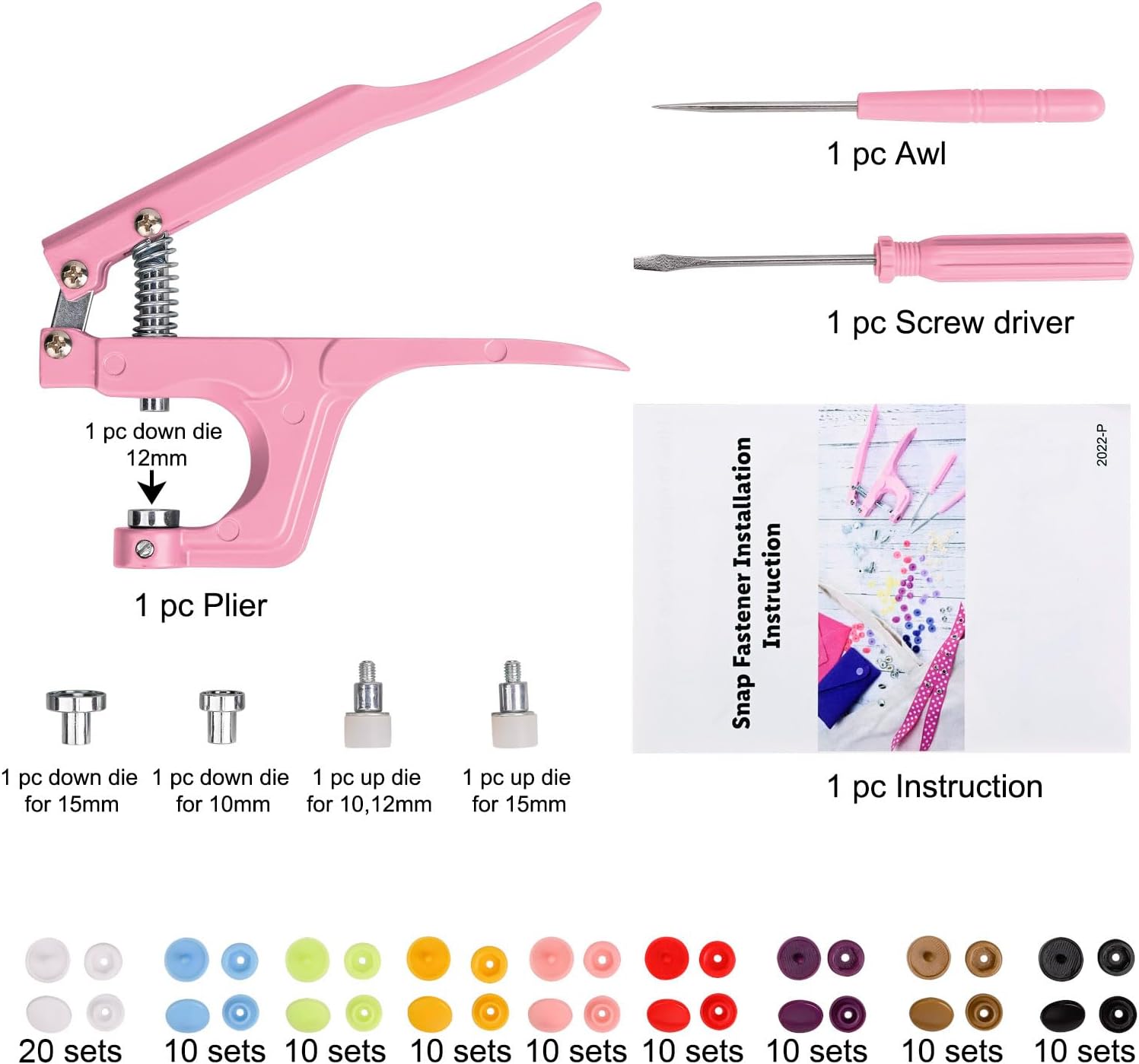 【Package Include】- 1) 1 x Aluminum Plier, 2) 3 x metal down dies (for T3(10mm), T5(12mm), T8(15mm) Snaps), 3) 2 x up dies, 4) 1 x screwdriver (to change different size dies), 5) 1 x awl (to poke a hole), 5) 100 sets snaps.